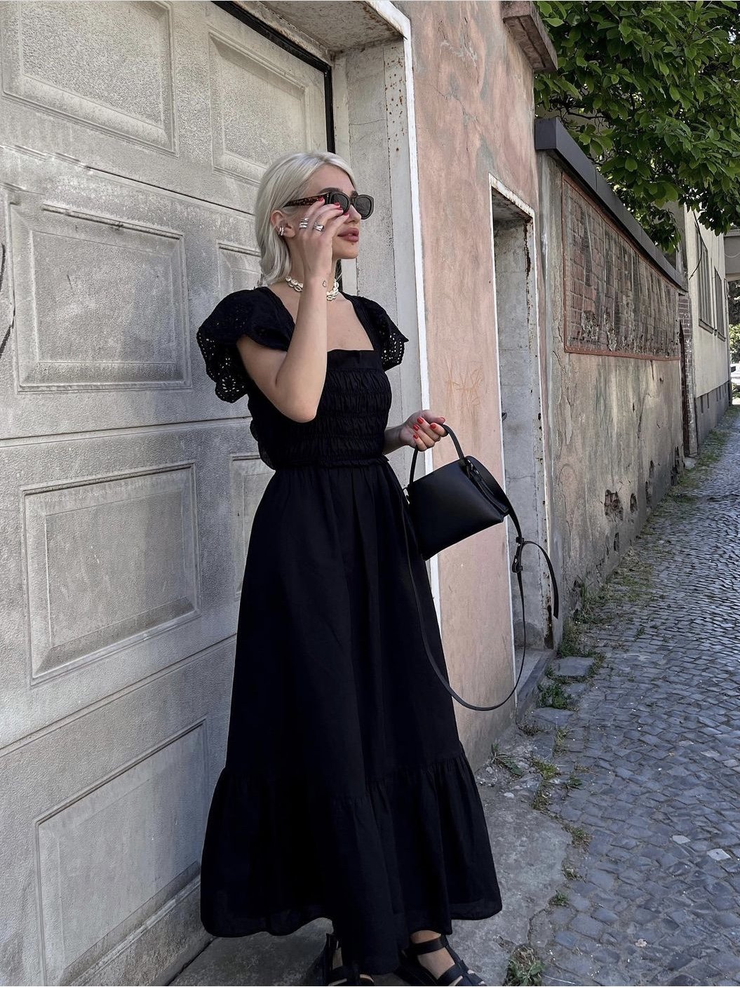 Charming princess sleeves add a romantic, sophisticated touch to the classic black style